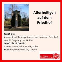 Am 1. November (Allerheiligen) gedenken wir namentlich der Verstorbenen des zurückliegenden Jahres im Wortgottesdienst um 16:00 Uhr auf dem Friedhof (am hinteren Kreuz), anschl. Segnung der Gräber.